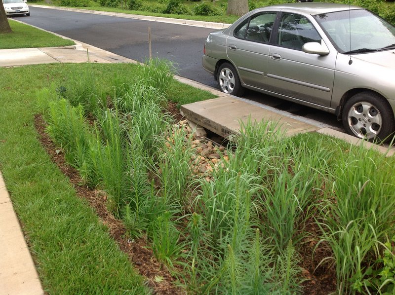 Switch grass is planted around the inlet to act as a strainer for entering silt and trash to enable easier maintenance of the inlet. Image credit: Montgomery County, MD, Department of Environmental Protection