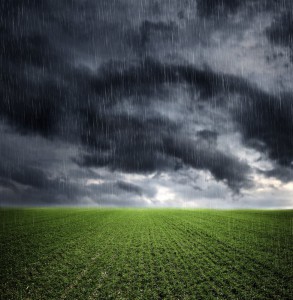 Dark storm clouds over meadow with green grass