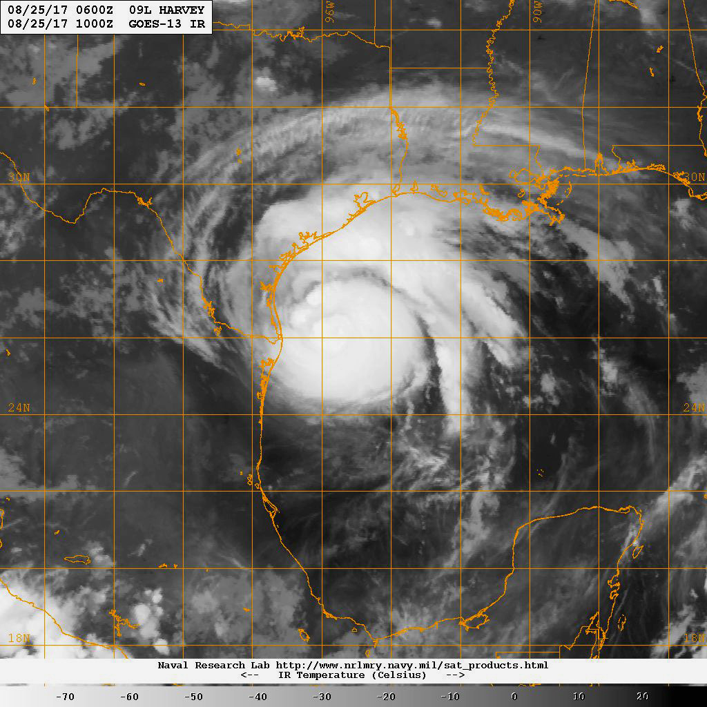 An infrared satellite image of Hurricane Harvey, a category 2 hurricane.